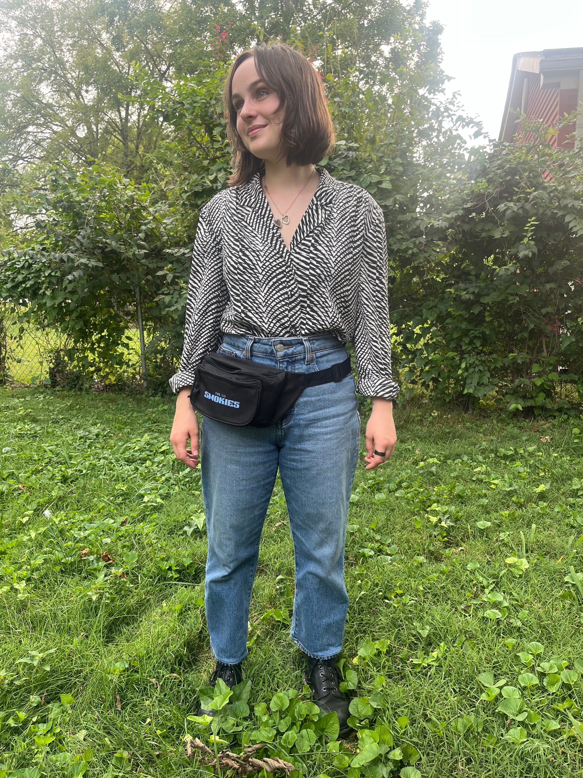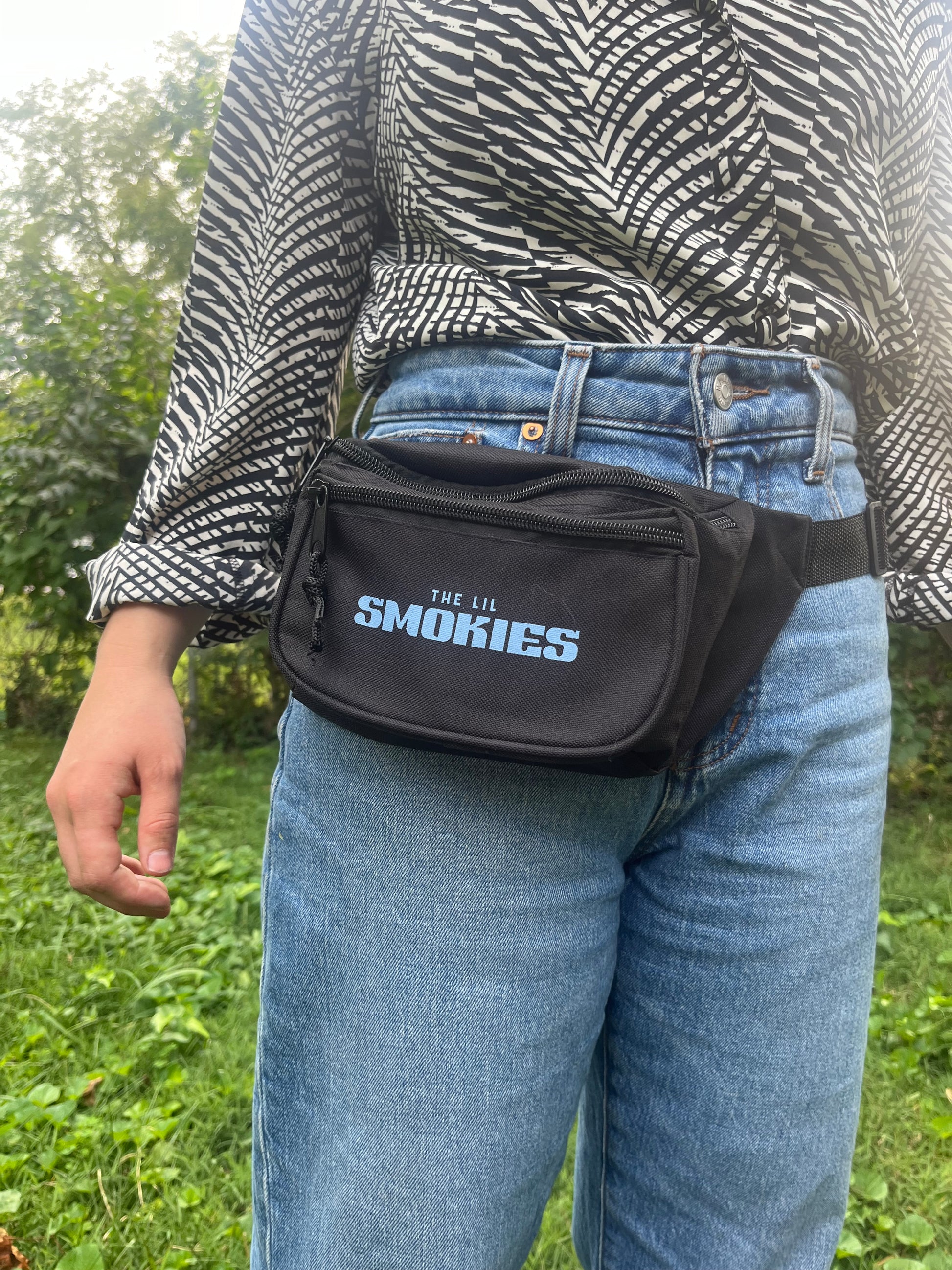 Fanny pack with three different zipper pouches. Adjustable hip strap for different sizes.